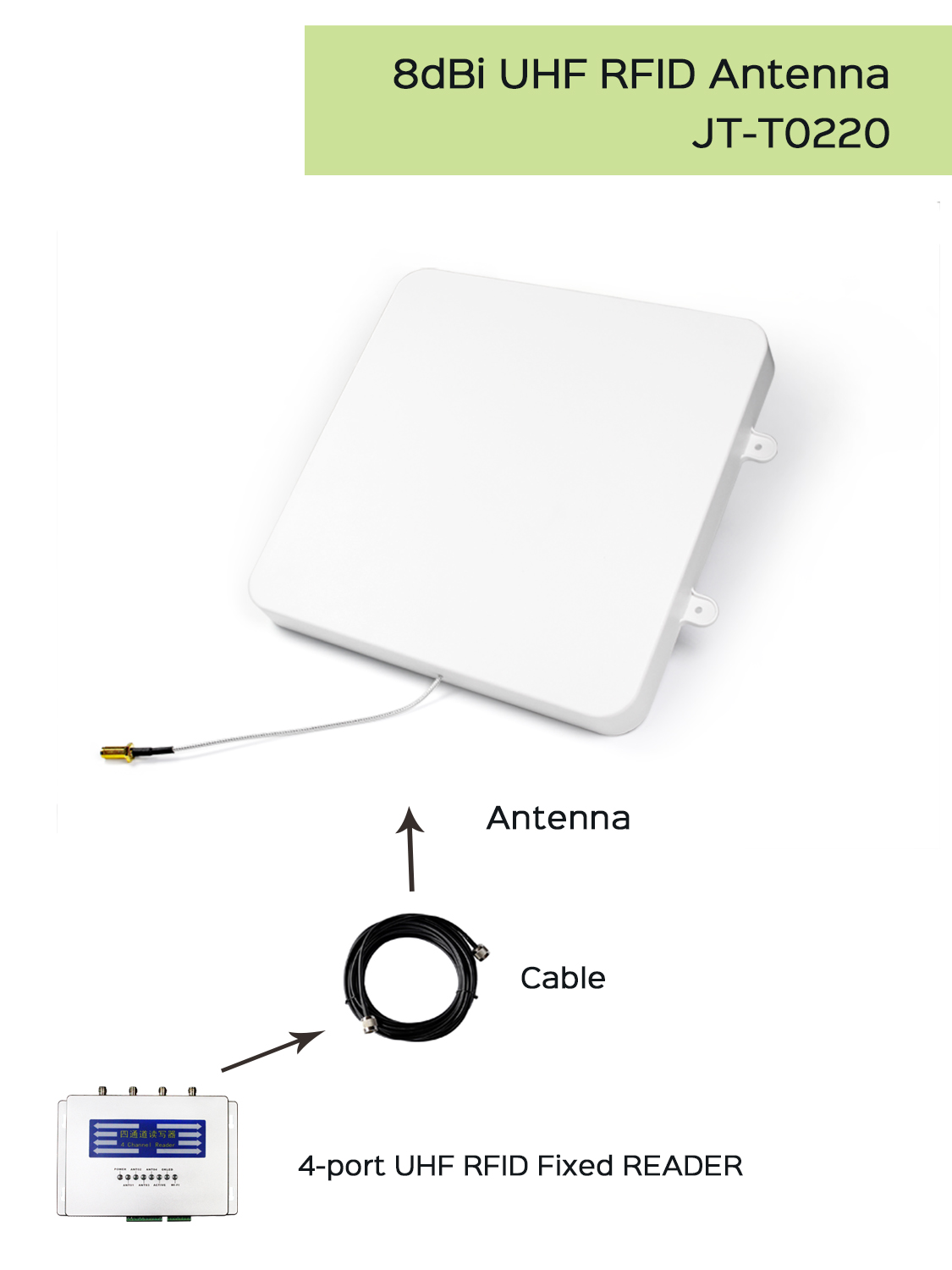 JT-T0220 é Uma antena de polarização circular de alto desempenho, universal, para uso em aplicações exigentes. Pode ser usada com todos os leitores fixos Gen2 do mercado. Os ambientes de aplicação incluem armazéns, centros de distribuição, aeroportos e hospitais, terminais de trânsito e correias transportadoras.