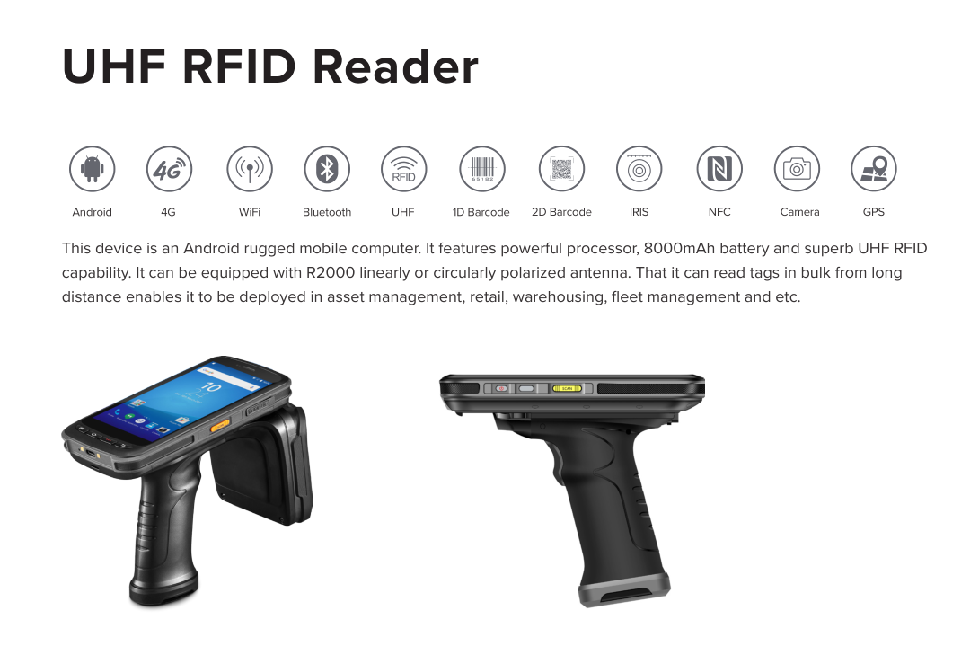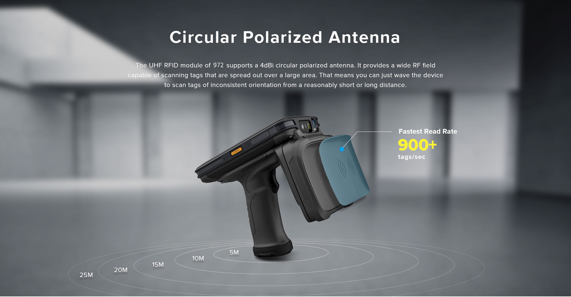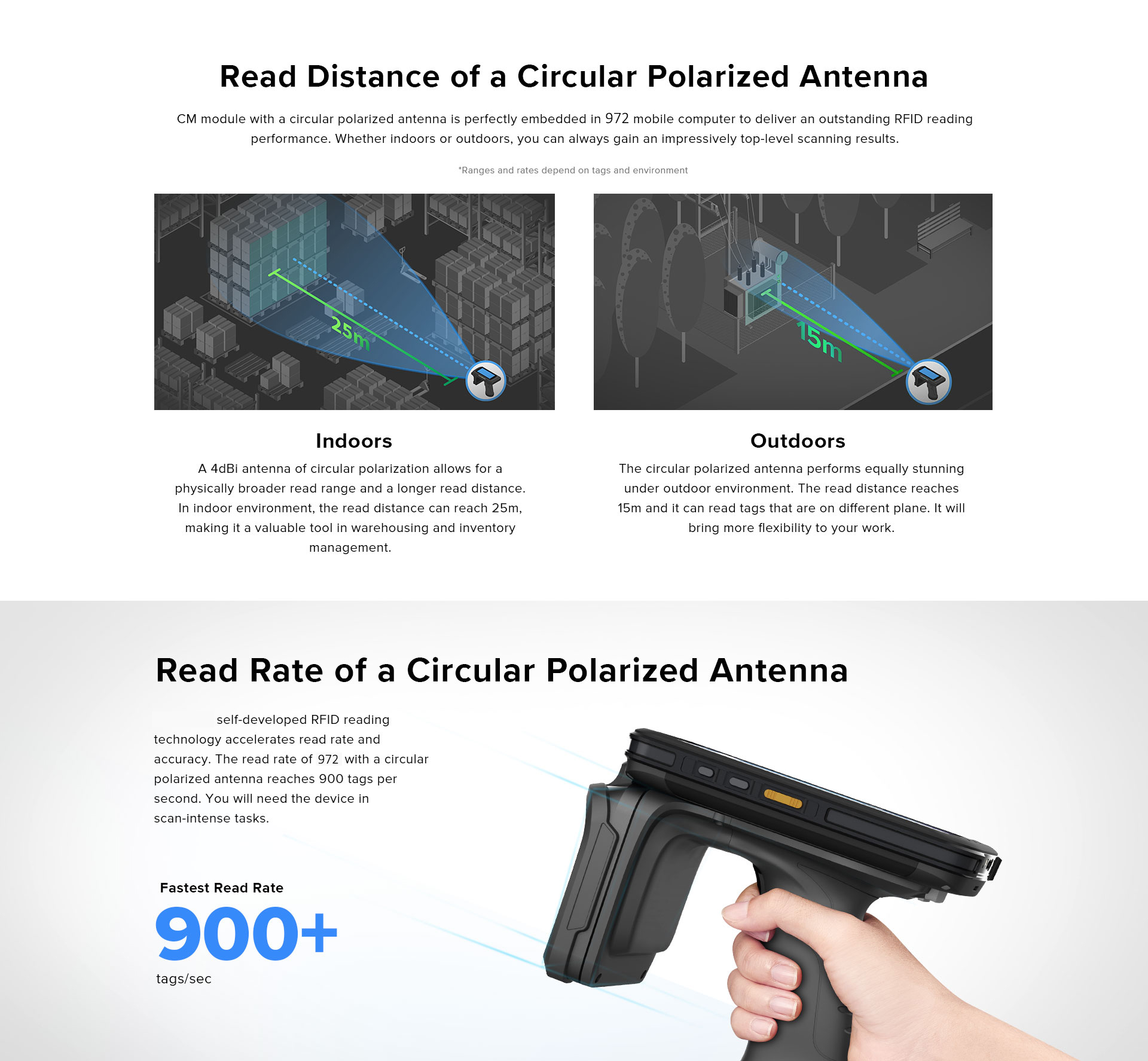 capacidade. Pode ser equipado com antena R2000 polarizada linear ou circularmente. Permite a leitura de etiquetas em massa a partir de longas distâncias.